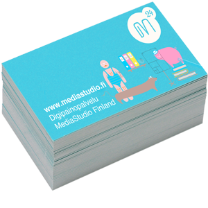 Digipainamme käyntikortit omasta valmiista aineistostasi. Tarvittaessa muokkaamme vanhaa aineistoasi tai suunnittelemme toiveidesi mukaisesti kokonaan uuden. Käyntikortin peruskoko on 90 x 50 mm. Toteutamme muut koot tilauksesta – pyydä tarjous tarpeesi mukaan.